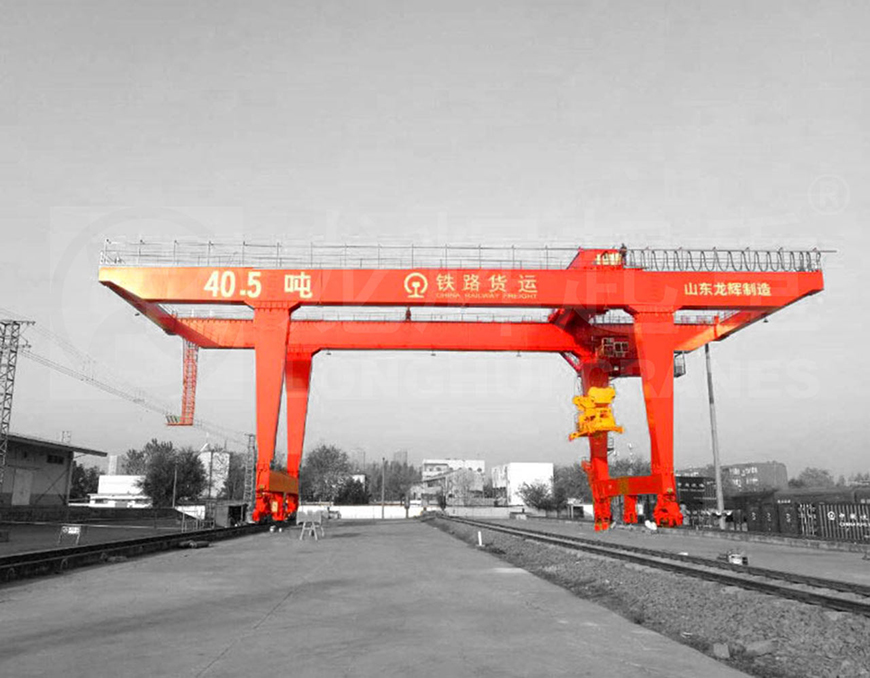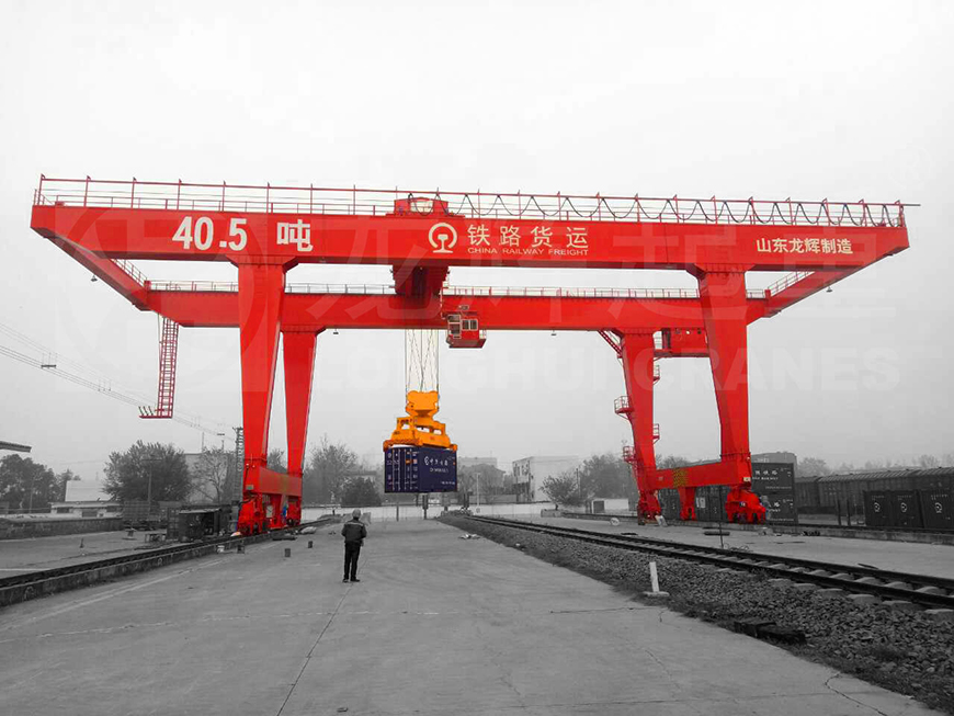 軌道式集裝箱門式起重機(jī),又叫做集裝箱龍門吊,是在集裝箱碼頭、鐵路轉(zhuǎn)運(yùn)場(chǎng)、堆場(chǎng)專用的門式起重機(jī),用于集裝箱的裝卸、搬運(yùn)和堆放。它的金屬結(jié)構(gòu)像門形框架,承載主梁下安裝兩條支腳,可以直接在地面的軌道上行走,主梁兩端可以具有外伸懸臂梁。