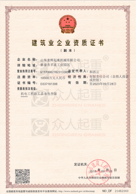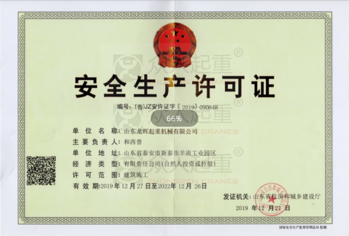 2019年12月27日,山東龍輝起重機械有限公司榮獲建筑施工安全生產許可證。建筑施工安全生產許可證是礦山企業(yè)、建筑施工企業(yè)和危險化學品、煙花爆竹、民用生產企業(yè)必備的一個證件,它和企業(yè)資質聯(lián)系在一塊,取得建筑施工資質證書的企業(yè),必須申請安全生產許可證,方可進行招投工作來接相應工程,兩個證件是有機整體。